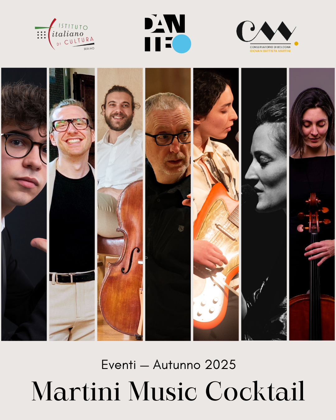 Insbesondere möchten wir euch zur ersten Ausgabe von MARTINI MUSIC COCKTAIL einladen, einer Veranstaltungsreihe, die aus der Zusammenarbeit unseres Vereins mit dem Italienischen Kulturinstitut in Berlin und dem Konservatorium „G.B. Martini” in Bologna entstanden ist, um jungen italienischen Musikern die Möglichkeit zu bieten, im Ausland an renommierten Bühnen aufzutreten.